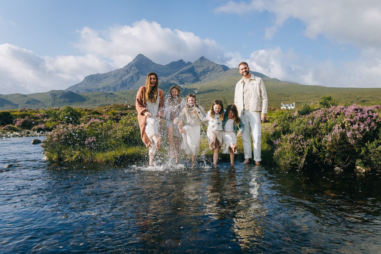We met early, while the light was still gentle over the Cuillin ridge. The sky held that delicate summer glow Skye does so well — bright but never harsh — and the water shimmered quietly as the children tiptoed in before bursting into laughter. That’s the magic of choosing the right location on Skye: space to breathe, to explore, and to simply be together.